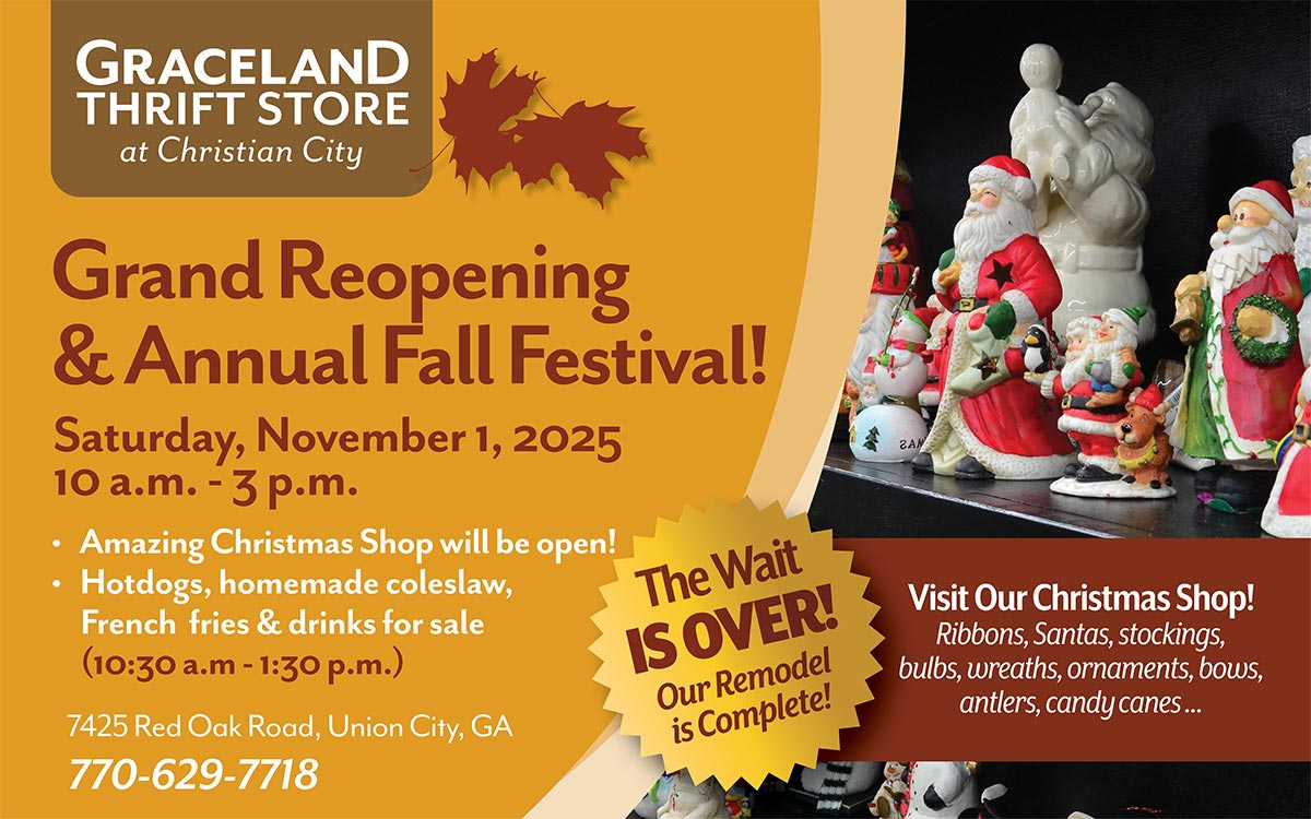 Continue past the entrance to the Christian City Welcome Center/Main entrance and pass Azalea Drive. Graceland Thrift Store is on your right behind the chain link fence. Donations are received at the front entrance facing Red Oak Road.
